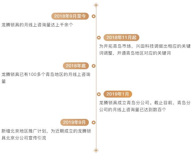 爲此,興田科技利用深耕行業多年積累的搜索營銷經(jīng)驗,爲山東龍騰鎖具公司量身定做一套搜索營銷方案,通過(guò)搜索引擎優化(SEO)和搜索競價(SEM)相結合的方式實現數千個關鍵詞在各大搜索引擎無死角覆蓋,24小時全天候展示,讓客戶無處遁形自動找上門。