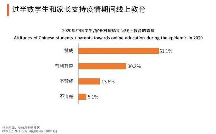 其中,近一半的家長(cháng)和學(xué)生對(duì)疫情期間線上教育持贊成(chéng)态度。