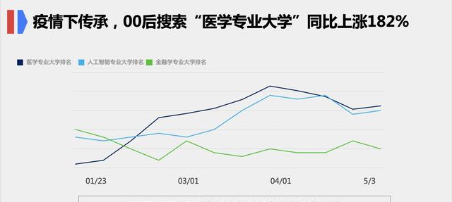 今年高考志願填報或許也將(jiāng)受到疫情的影響。疫情發(fā)生以來,相比熱門的金融專業,00後(hòu)對(duì)于醫學(xué)專業更爲關注。百度搜索大數據顯示,近90天,00後(hòu)對(duì)于"醫學(xué)專業大學(xué)排名"的搜索度同比上漲182%,顯然,疫情中醫生的無私奉獻讓越來越多的年輕人産生從醫的意願。此外,疫情下科技力量助力抗疫,也讓"人工智能(néng)專業"成(chéng)爲搜索熱度上漲最快的專業之一。