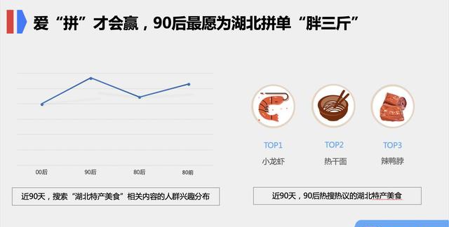 一個月之前,武漢解封,全網積極爲湖北及武漢"拼單"。而這(zhè)其中,90後(hòu)是最爲積極的人群。百度搜索大數據顯示,近90天,90後(hòu)對(duì)"湖北特産美食"的搜索興趣最高,成(chéng)爲搜索湖北特産美食的主力軍。其中,"小龍蝦""熱幹面(miàn)""辣鴨脖"成(chéng)爲90後(hòu)最關注的湖北特産美食。