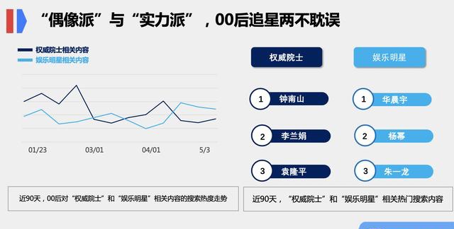 提及00後(hòu),追星是外界常想到的第一标簽。華晨宇、楊幂等明星在00後(hòu)中有著(zhe)強大的粉絲基礎,但這(zhè)場疫情也讓鍾南山、李蘭娟等"實力派"受到00後(hòu)的關注。百度搜索大數據顯示,近90天,00後(hòu)對(duì)鍾南山、李蘭娟、袁隆平等"實力派"權威院士的搜索熱度環比增長(cháng)107%,一度超過(guò)華晨宇、楊幂等明星。