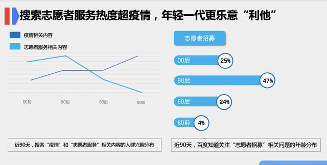 百度搜索大數據顯示,近90天,90後(hòu)對(duì)"志願者服務"的搜索熱度最高,00後(hòu)次之;同樣(yàng)的,從百度知道(dào)關注"志願者招募"相關問題的年齡分布來看,90後(hòu)占比47%,幾乎占據半壁江山,00後(hòu)占比25%,排名次席。年輕一代奉獻意識強烈。