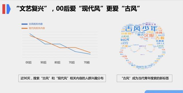 值得注意的是,青年群體擁有更多元的文化構成(chéng)。無論是亞文化還(hái)是主流文化,當代年輕人的興趣都(dōu)足夠豐富多彩。百度搜索大數據顯示,近90天,90後(hòu)對(duì)于"現代風"的搜索興趣超"古風",而00後(hòu)對(duì)于"古風"的搜索興趣超"現代風",這(zhè)也反映出當代年輕群體的文化包容性。