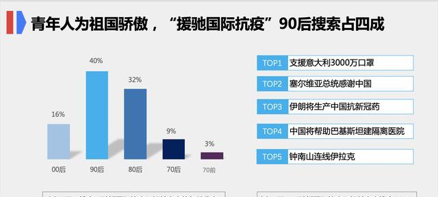 海外疫情的肆虐也受到青年的關注。百度搜索大數據顯示,近90天,90後(hòu)搜索"馳援國(guó)際抗疫"占比達40%,遠高于其他年齡段人群。在"馳援國(guó)際抗疫"相關内容的搜索中,"支援意大利3000萬口罩""塞爾維亞總統感謝中國(guó)""伊朗將(jiāng)生産中國(guó)抗新冠藥"等成(chéng)爲年輕人最爲關注的TOP5問題。心系天下大事(shì)、爲祖國(guó)感到驕傲已成(chéng)爲這(zhè)代青年的新特征。