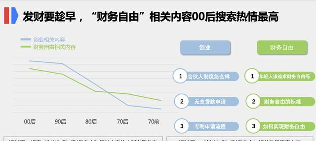 疫情之下被(bèi)"解鎖"的不僅有年輕人的生活技能(néng),還(hái)有财務意識。越來越多的00後(hòu)盯上了創業及财務自由。百度搜索大數據顯示,近90天,00後(hòu)對(duì)于"創業""财務自由"表現出更高的搜索積極性,位居各年齡段首位。另外,"合夥人制度怎麼(me)樣(yàng)""無息貸款怎麼(me)申請""專利申請流程"等内容成(chéng)爲00後(hòu)搜索創業相關内容時的熱門内容。