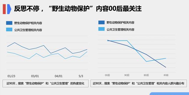 年輕人對(duì)疫情的反思也從未停止。百度搜索大數據顯示,近90天,90後(hòu)、00後(hòu)對(duì)"野生動物保護""公共衛生管理""野生動物保護立法"表現出更高的搜索積極性,遠超其他年齡段,疫情不止,青年的"追問"也預示著(zhe)社會前進(jìn)的方向(xiàng)。