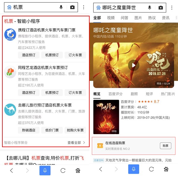 當搜索模糊關鍵詞,如“機票”,或搜索某一部電影時,首頁也會出現相關的小程序。