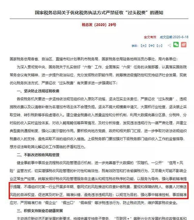 近日,國(guó)家稅務總局在網站公布了《關于優化稅務執法方式嚴禁征收“過(guò)頭稅費”的通知》。通知中明确要求各級稅務機關,不得組織對(duì)某一行業開(kāi)展多年期、撒網式的風險推送和自查補繳稅費。