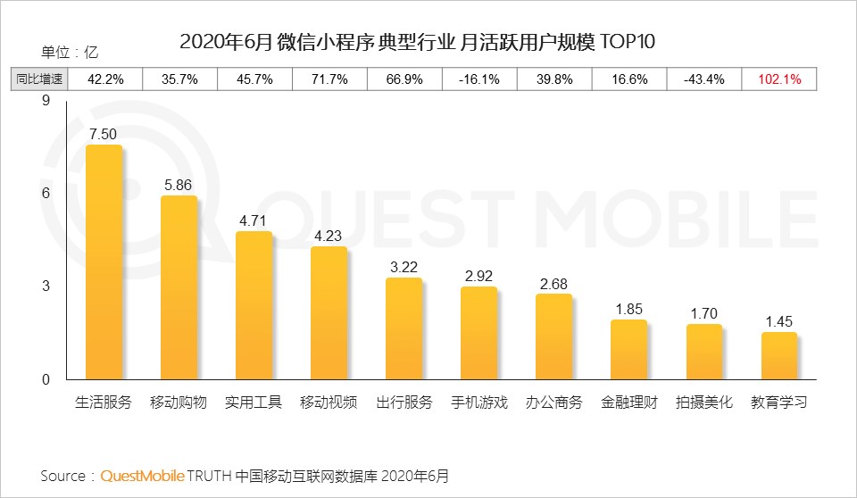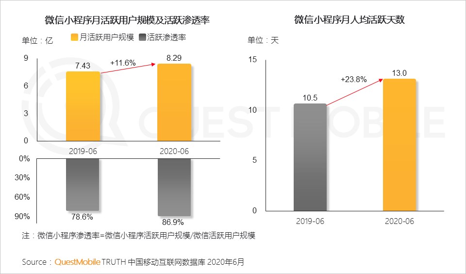 擁有12.025億月活賬戶的微信流量池也成(chéng)爲微信小程序得天獨厚的獲客優勢。截至2020年6月,微信小程序月覆蓋用戶規模已經(jīng)達到8.3億,相比去年增長(cháng)了11.6%,用戶黏性也在持續提升,人均活躍天數同比也提升了23.8%;