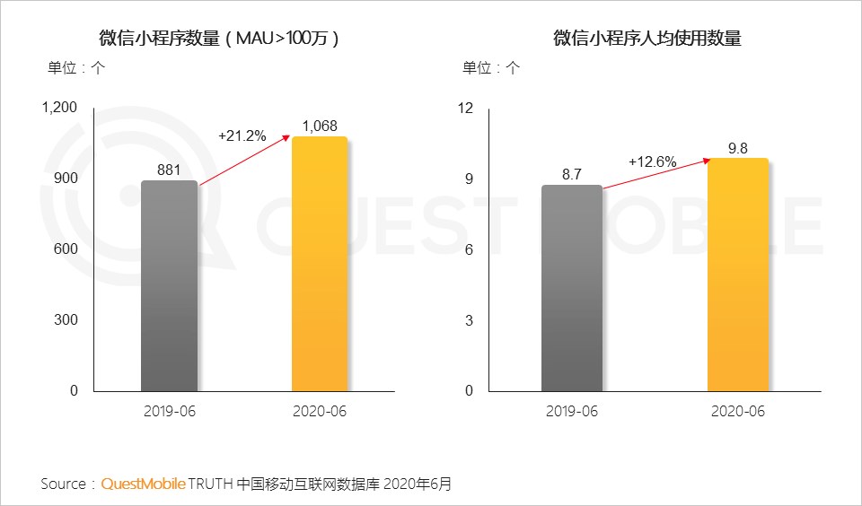 月活用戶規模百萬以上小程序已經(jīng)突破1000個,用戶人均使用個數也增加到了9.8個。