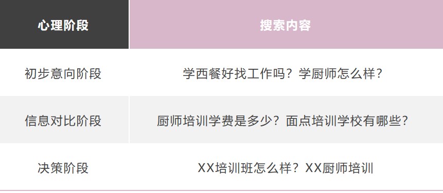 搜索是出于用戶的主動行爲,行爲背後(hòu)反映了用戶在不同心理階段的不同需求。以廚師培訓爲例: