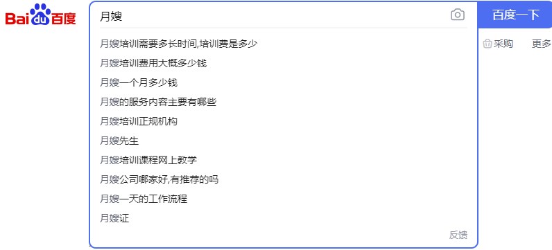 百度下拉框中當鍵入某個詞組時,下拉列表中存在不少提示,這(zhè)些提示都(dōu)是與之相關的長(cháng)尾關鍵詞。家政企業可以圍繞家政培訓相關關鍵詞進(jìn)行思路擴展,增加一些修飾詞短語,例如:月嫂好(hǎo)找工作嗎?家政好(hǎo)幹嗎?前景怎麼(me)樣(yàng)?