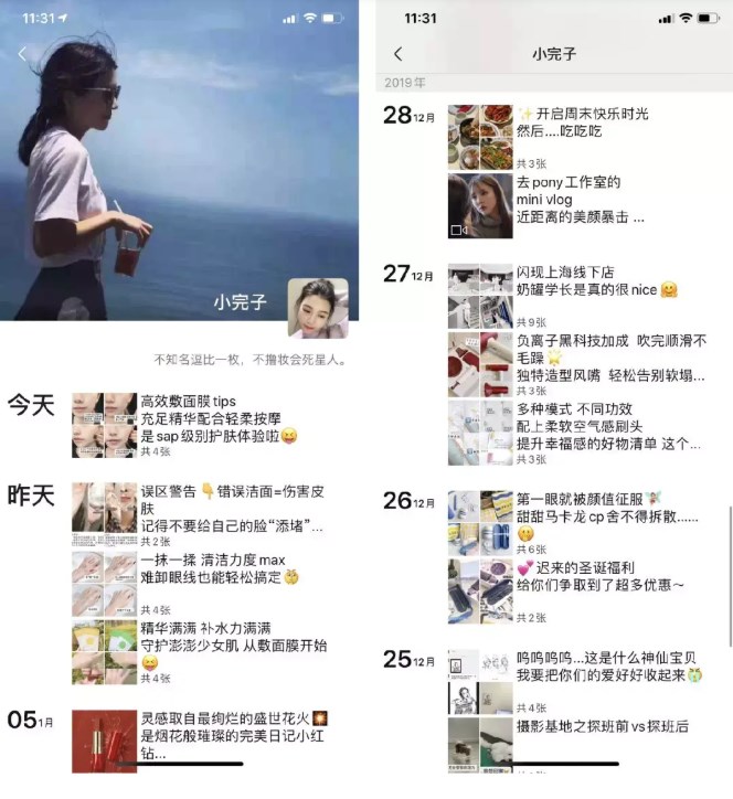 首先,完美日記給自己的微信打造了個人設——“小完子”。她的朋友圈并不全都(dōu)是産品廣告,而是會經(jīng)常在朋友圈發(fā)自拍,發(fā)網紅店打卡照,發(fā)美食照,具有十足的“人性”和生活氣息。在介紹産品時,則會用專業的測評、真人試用圖片凸顯自身的專業性。