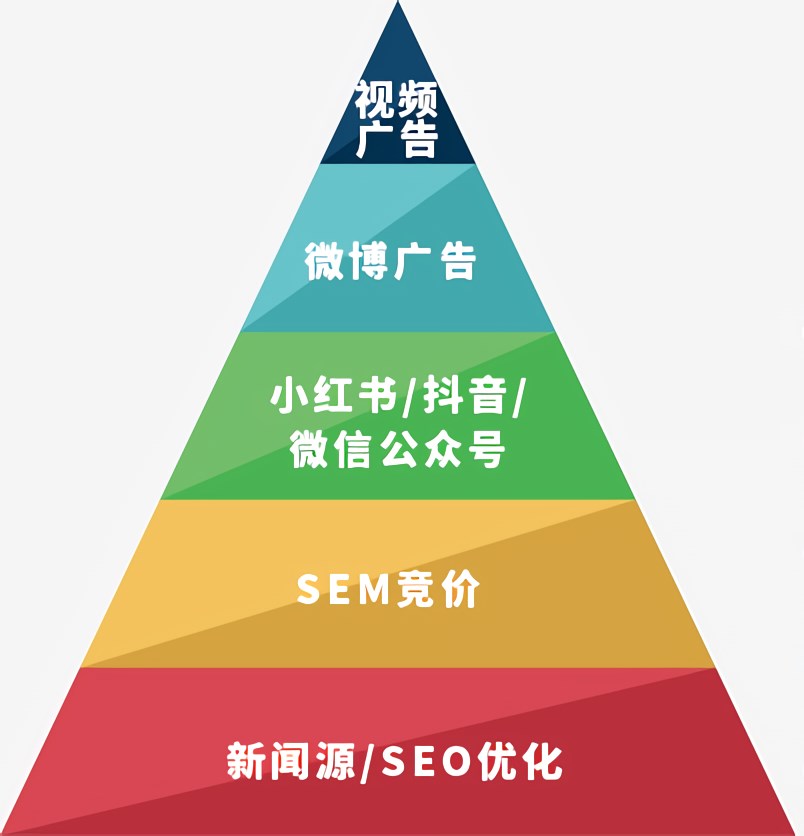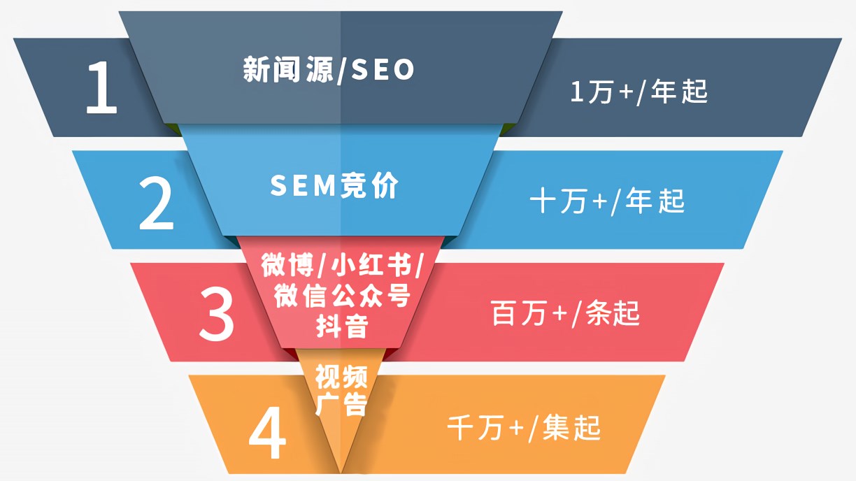 目前的線上媒體廣告投放渠道(dào)按價格從高到低排序,可以分爲以下五個等級:互聯網視頻廣告、微博廣告、小紅書/抖音/微信公衆号、SEM競價、新聞源/SEO。
