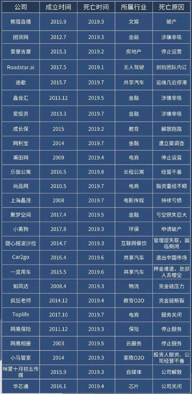 在IT桔子發(fā)布的《死亡公司公墓——新經(jīng)濟死亡公司數據庫》中,2019年上半年壯烈陣亡268家企業,死亡公司排名前五的行業,分别是金融(48家)、電子商務(30家)、本地生活(29)、企業服務(23)、教育(21家)。緊随其後(hòu)的行業爲汽車交通及文娛傳媒,均爲18家,社交網絡行業死亡公司數量也達到了16家。