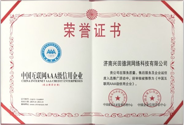 近日,興田科技憑借在互聯網領域深耕七年的技術經(jīng)驗優勢、優質的服務水平和完善的售後(hòu)體系,在合作客戶中享有極高的企業信譽度和美譽度,被(bèi)中國(guó)質量認證監督管理中心、中國(guó)企業信用評估中心評選爲中國(guó)互聯網AAA級信用企業。