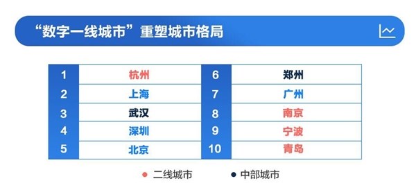 從總指數評分來看,杭州、上海、武漢、深圳、北京、鄭州、廣州、南京、甯波、青島成(chéng)爲前十名,組成(chéng)了數字一線城市十強陣容。尤其亮眼的是,傳統意義上屬于二線城市的鄭州取得了第六名的好(hǎo)成(chéng)績。