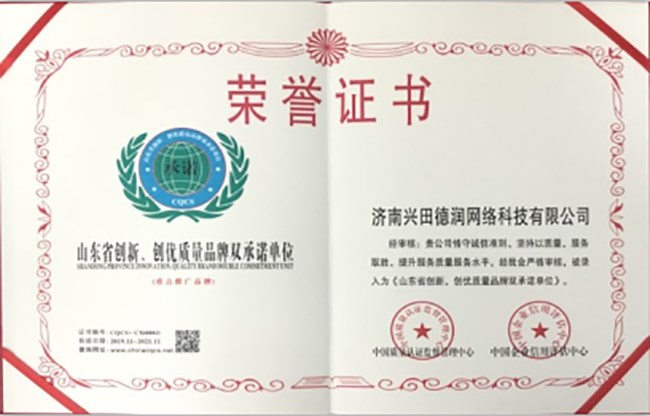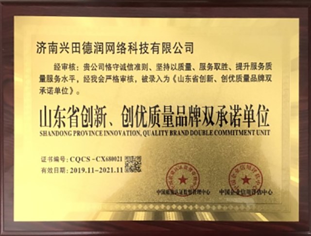 近日,興田科技經(jīng)中國(guó)質量認證監督管理中心、中國(guó)企業信用評估中心對(duì)公司及官方網站的征信調查和綜合評價,被(bèi)評選爲山東省創新、創優質量品牌雙承諾單位。這(zhè)标志著(zhe)興田科技在綜合實力、企業競争力、服務質量水平、安全運營能(néng)力等方面(miàn)再次獲得了權威機構的高度認可。